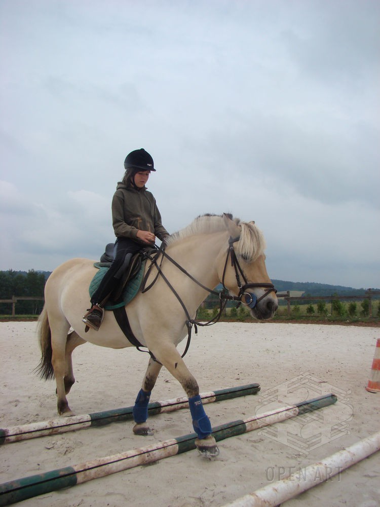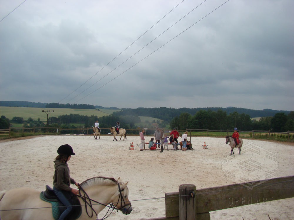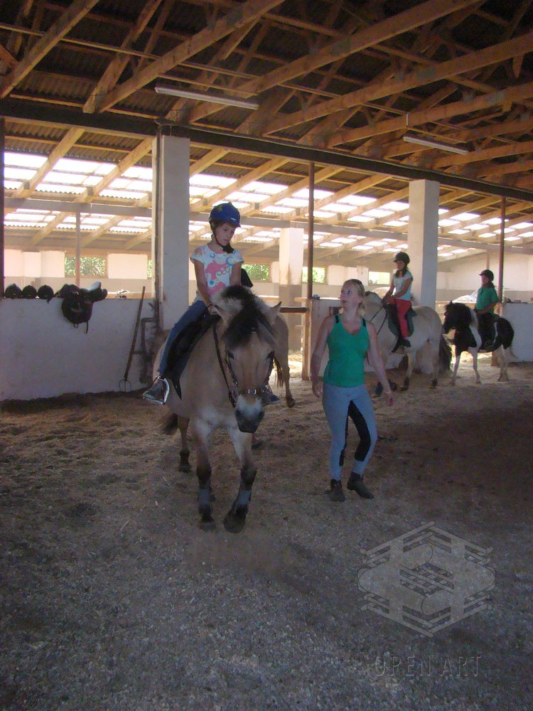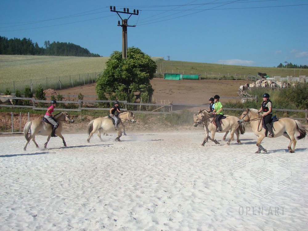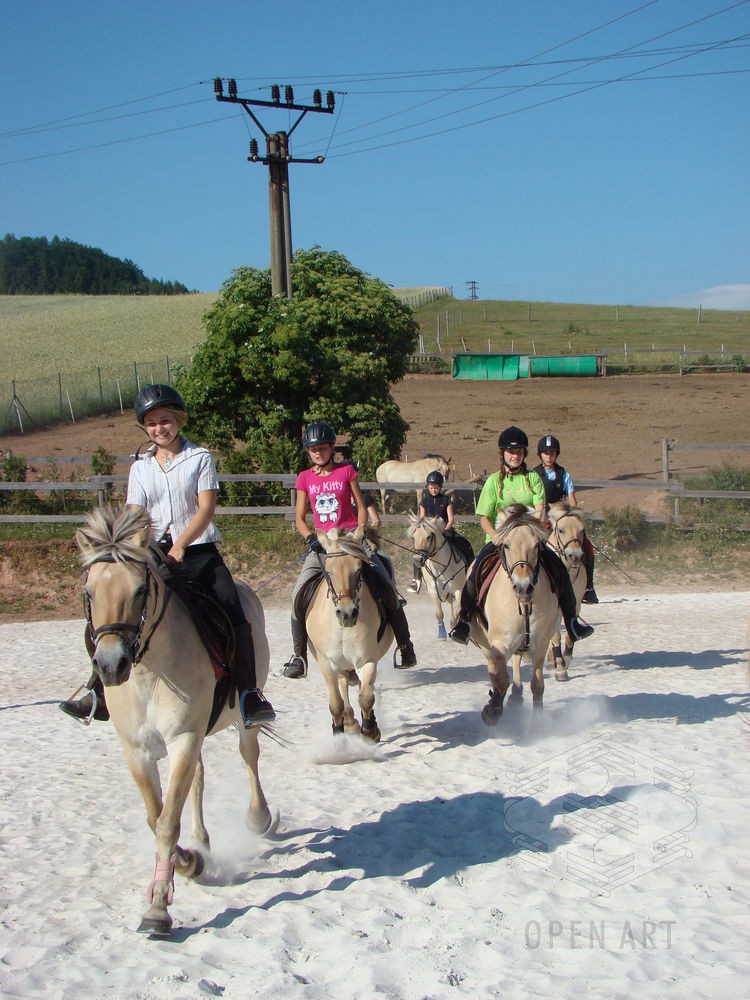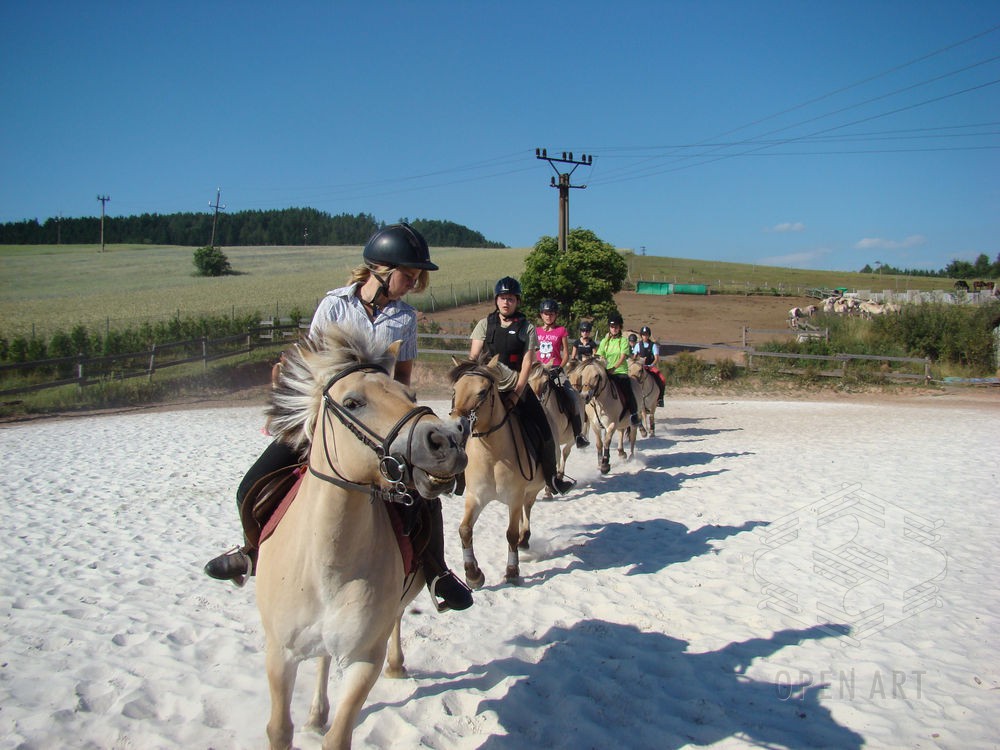 Týden s koňmi o koních. Pro začátečníky od 10 let. Jezdecký výcvik dětí bude probíhat denně v areálu jezdecké farmy Stará Paka. Farma vlastní v ČR unikátní stádo 20 malých horských koní plemene Fjord, dovezených z Holandska. Koně jsou menšího vzrůstu (do 155 cm kohoutkové výšky), a proto jsou se svojí klidnou a milou povahou vhodné k práci s dětmi. Děti (začátečníci) se během výcviku naučí základy ježdění a ošetřování koní. V ceně je zahrnuto 10 hodin jízdy na koni.