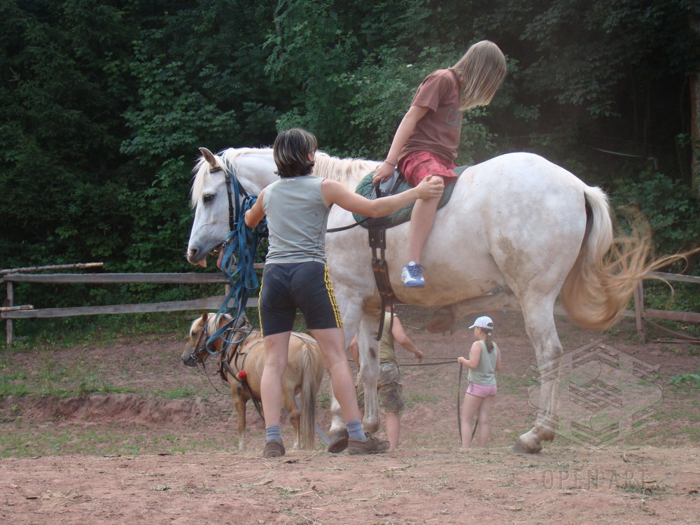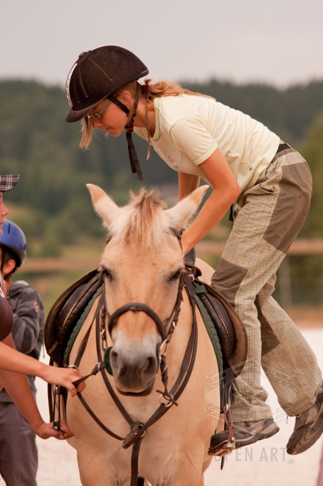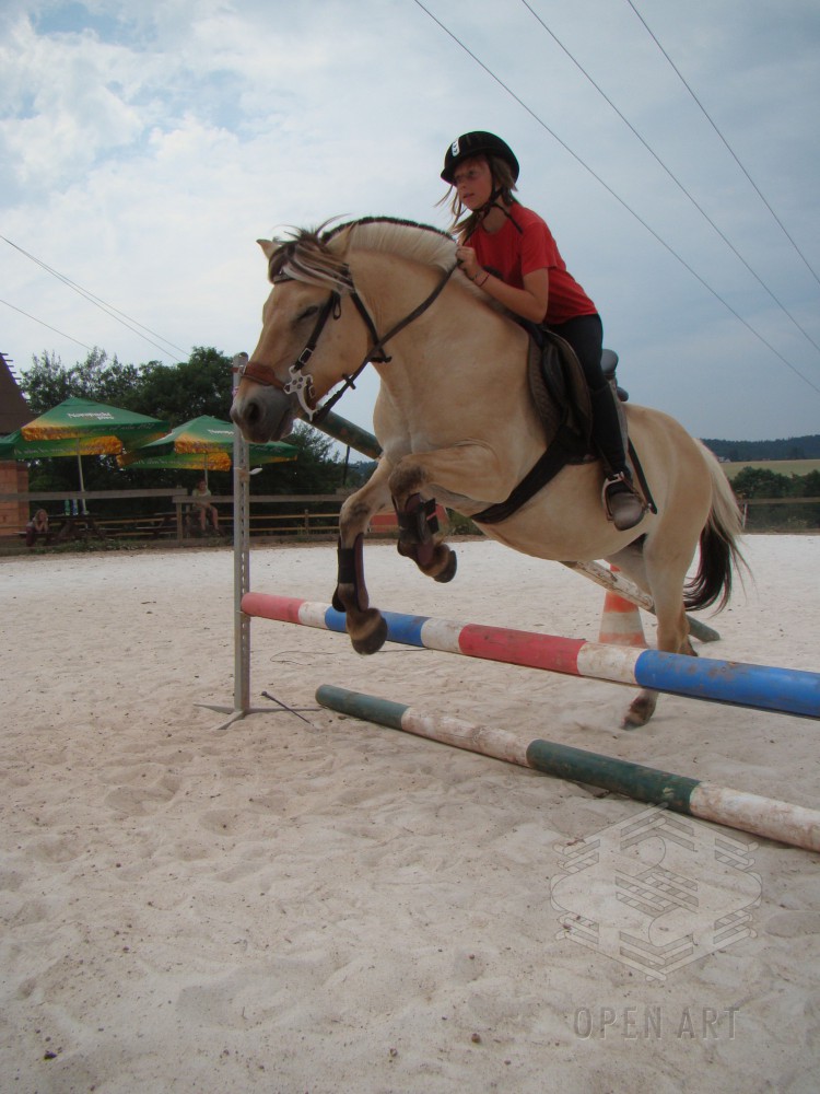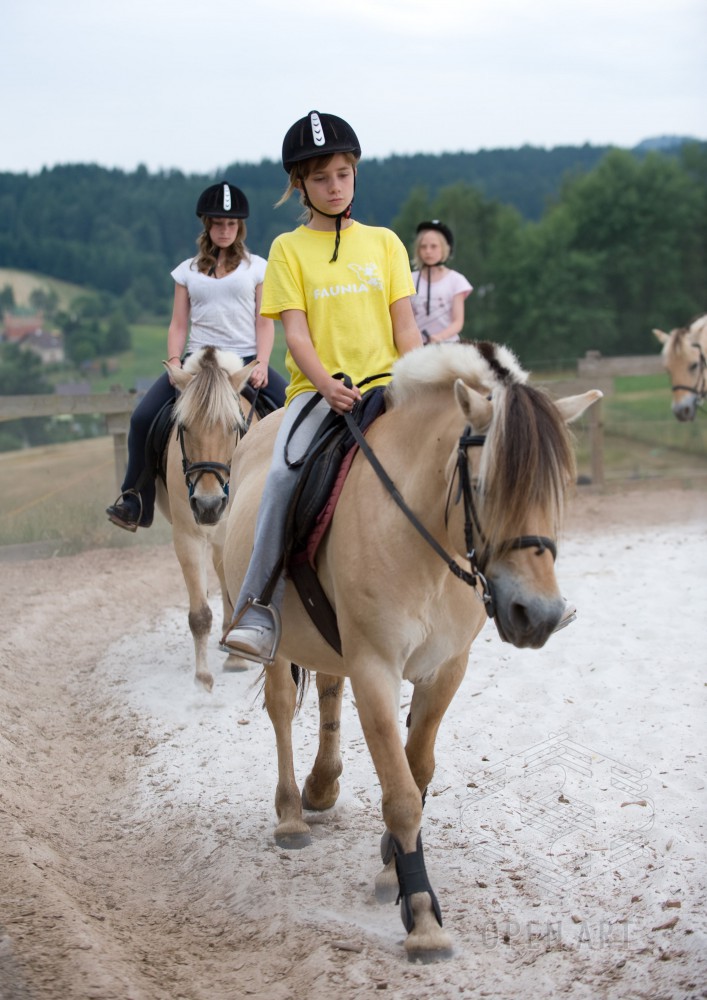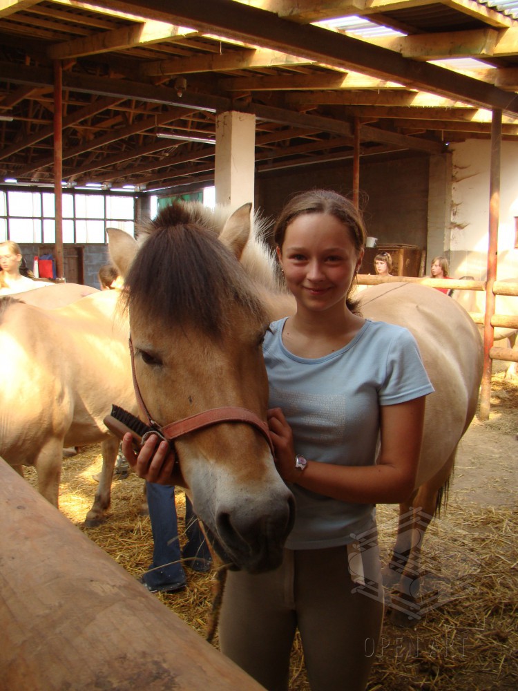 Týden s koňmi o koních. Pro začátečníky od 10/12 let. Jezdecký výcvik dětí bude probíhat denně v areálu jezdecké farmy Stará Paka. Farma vlastní v ČR unikátní stádo 20 malých horských koní plemene Fjord, dovezených z Holandska. Koně jsou menšího vzrůstu (do 155 cm kohoutkové výšky), a proto jsou se svojí klidnou a milou povahou vhodné k práci s dětmi. Děti (začátečníci) se během výcviku naučí základy ježdění a ošetřování koní. V ceně je zahrnuto 10 hodin jízdy na koni.