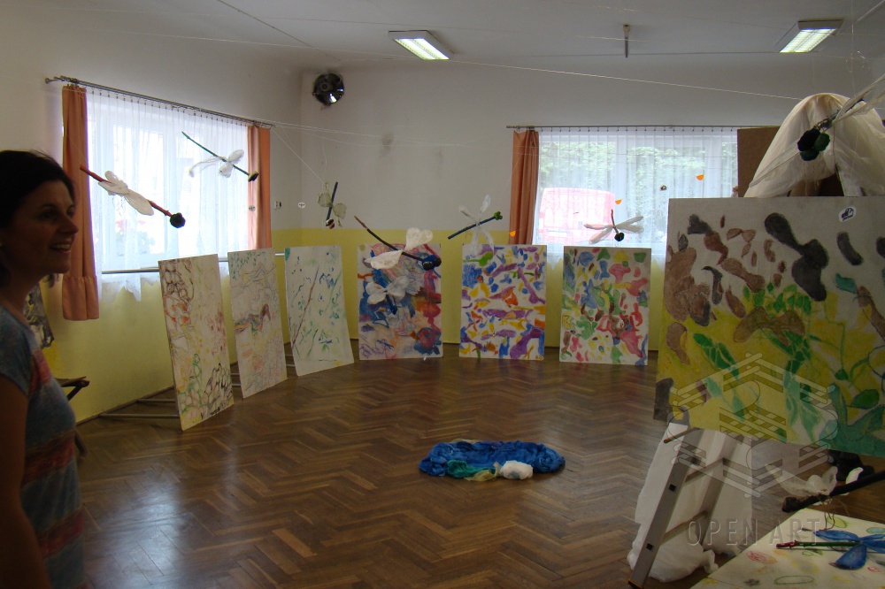 Výtvarná dílna byla v sobotu 13.7. zakončena vernisáží v roškopovském kulturním domě; pro děti byla ale vrcholem týdne čtvrteční noční hra, ve které se vydaly po stopách tajemné stonožky, kterou měly za úkol vypátrat a … obout : ) Obutá stonožka pak byla součástí sobotní výstavy : )